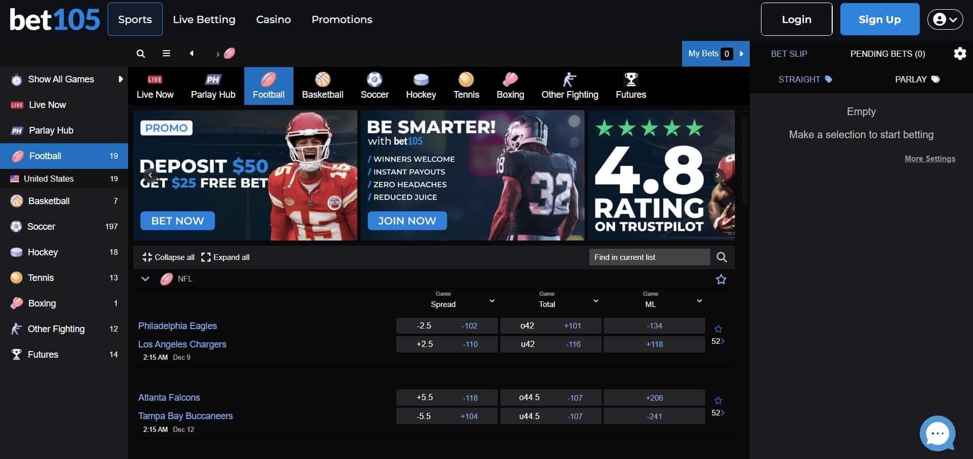 Bet105 targets sharp bettors using sports betting Texas offshore who care more about price than flashy promos. The key selling point is its -105 reduced juice on many spreads and totals, which improves long term value compared with standard -110 lines. The market range is smaller than at giant books, but core US sports, soccer and main fight cards are covered, with live betting on top.
